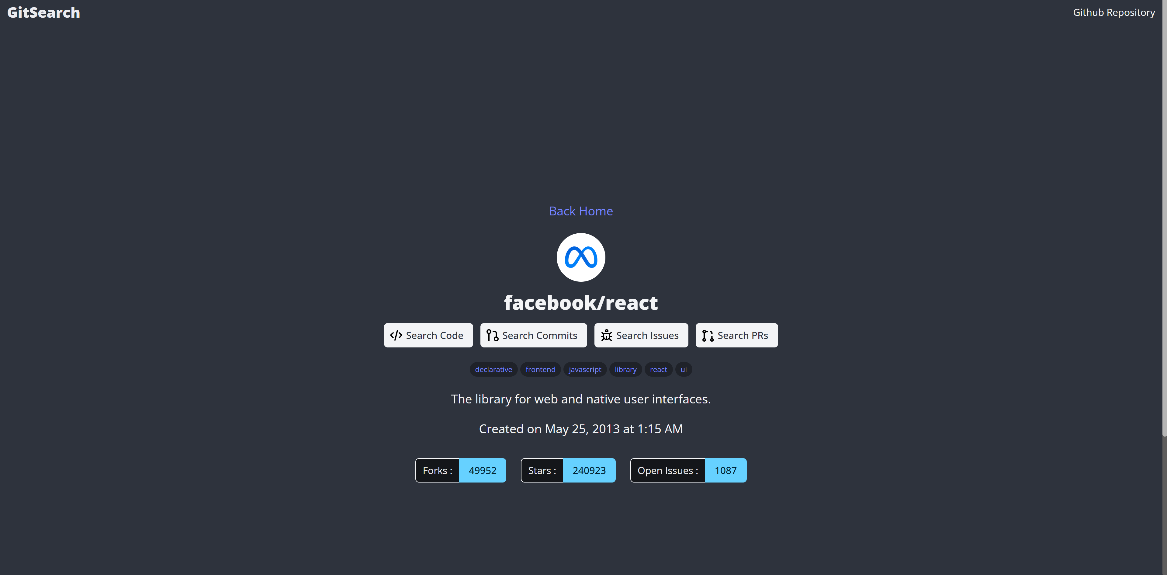 For the last week or so, I've worked on a little project that allows for searching GitHub repos using the Github REST API, and this project is using React and some other cool stuff. Whilst there are things I would change upon reflection, I am pretty happy with the way it turned out.