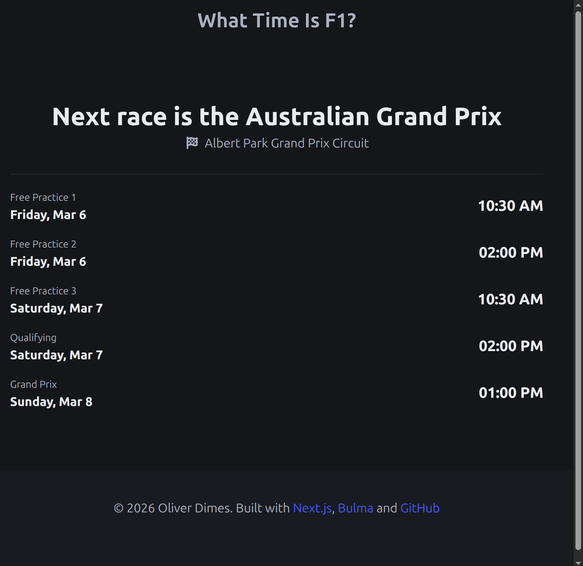 With the upcoming 2026 season coming up, wanted to create a quick way to show the time for F1 without having to navigate through ad-riddled articles